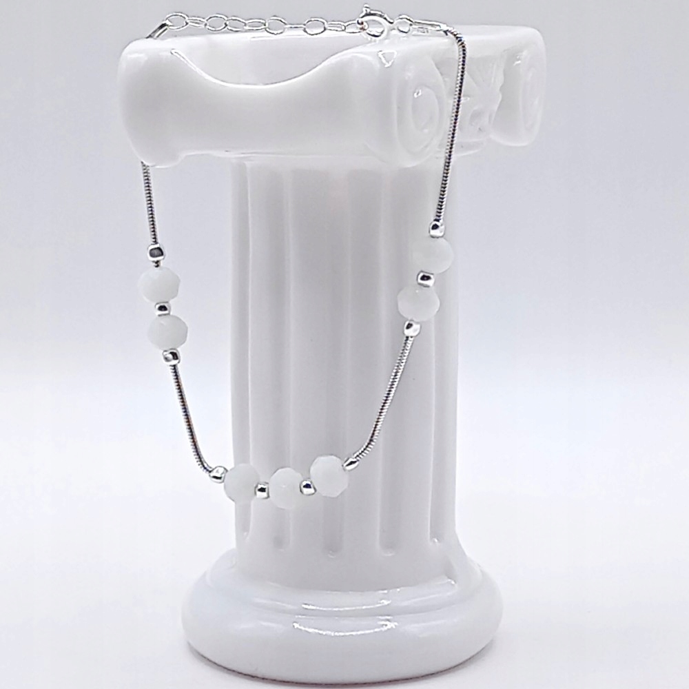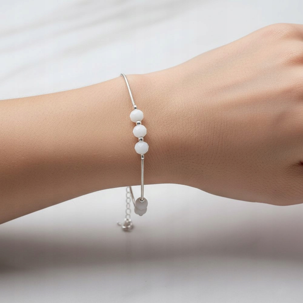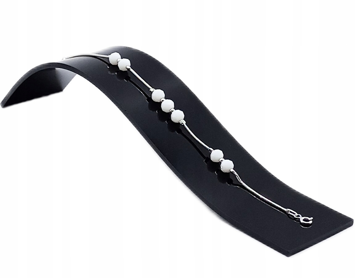Kulki są ułożone w unikalny wzór: układ 2 na 3, oddzielone odcinkami lśniącej żmijki. Każda kulka jest precyzyjnie zabezpieczona zaciśniętymi srebrnymi stoperami, co gwarantuje stabilność i trwałość wzoru.