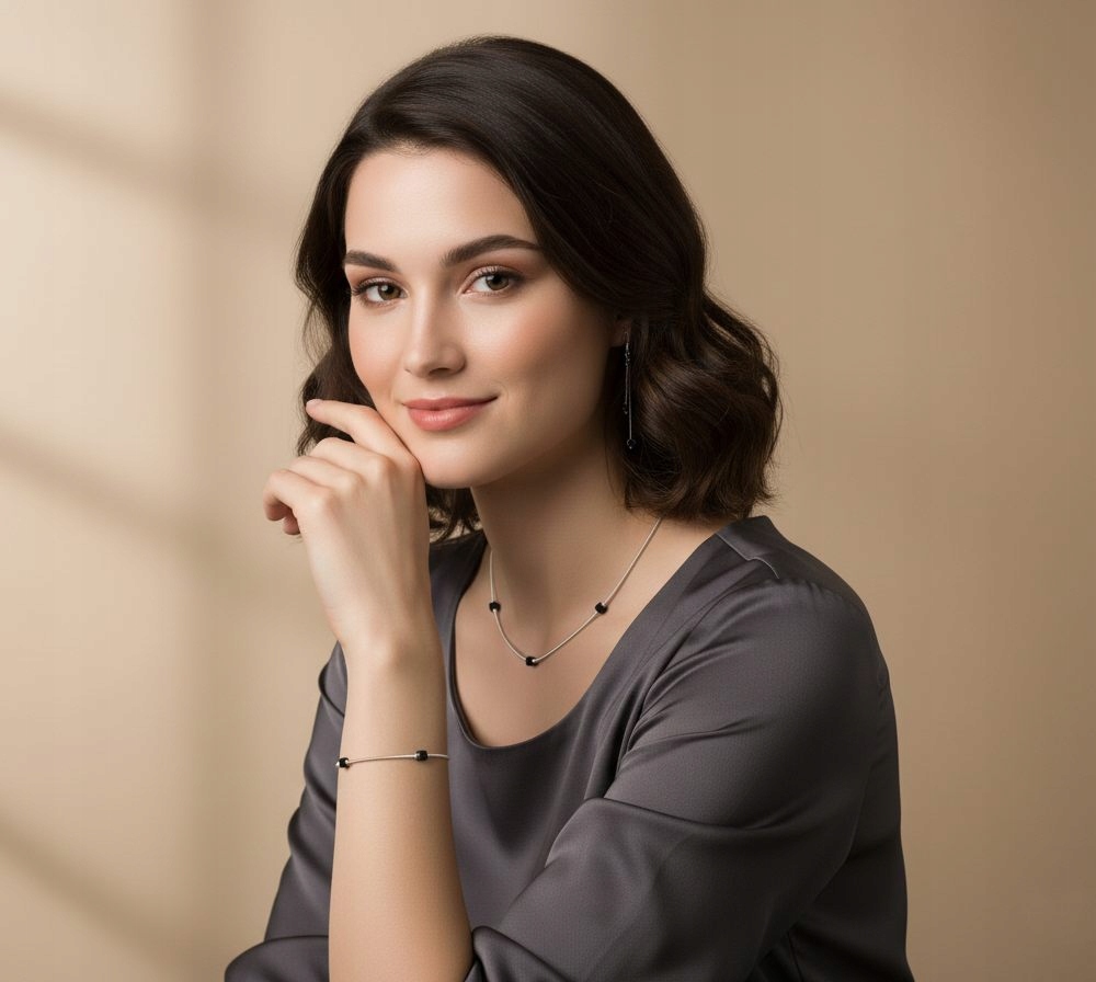 Bransoletka pięknie prezentuje się w zestawie z resztą biżuterii, ale jest też wystarczająco stylowa, by nosić ją samodzielnie jako wyrafinowany, czarny akcent na nadgarstku.