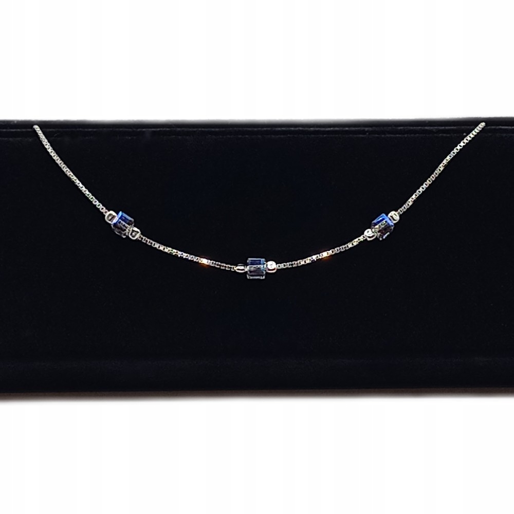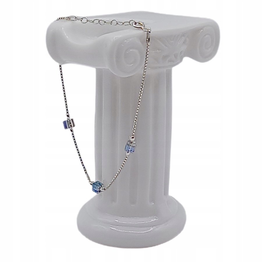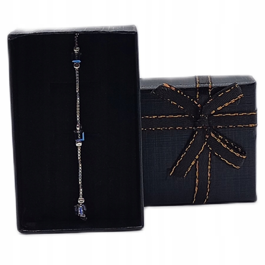 Całość ozdabiają niebieskie, kryształowe elementy, które subtelnie mienią się światłem, nadając bransoletce oryginalny, ale nie krzykliwy charakter.