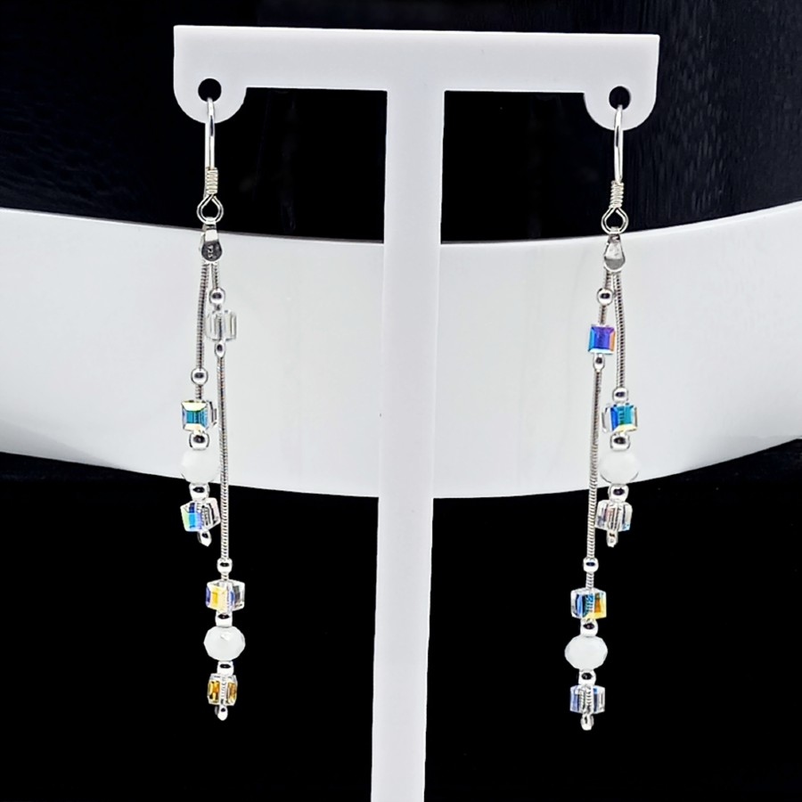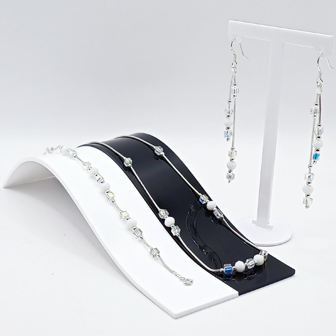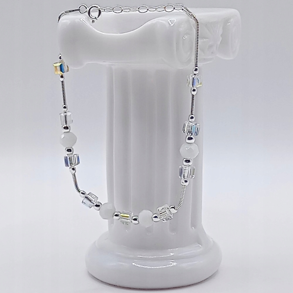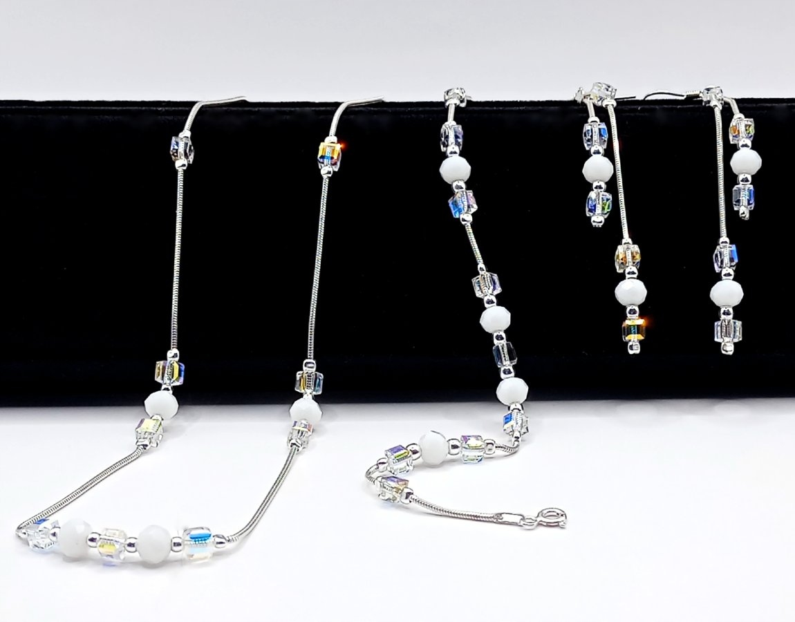 Niech ten komplet będzie Twoim talizmanem w tym najważniejszym dniu – symbolem czystości (białe fasetowane kulki) i magii Waszej miłości (mienienie multikoloru).