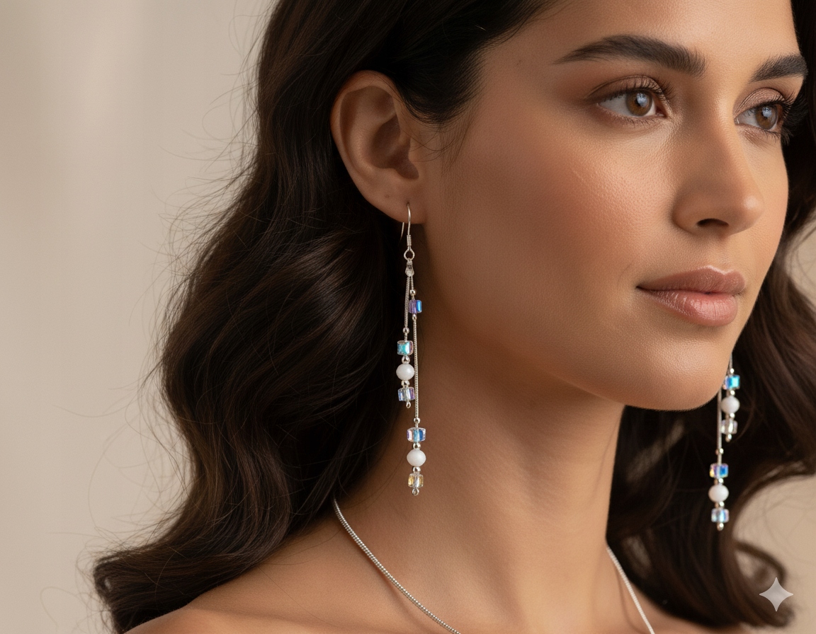 Kolczyki mają innowacyjną, podwójną i stopniowaną konstrukcję. Tworzą efekt świetlistego wodospadu, który delikatnie porusza się przy każdym ruchu, dodając dynamiki i gracji.