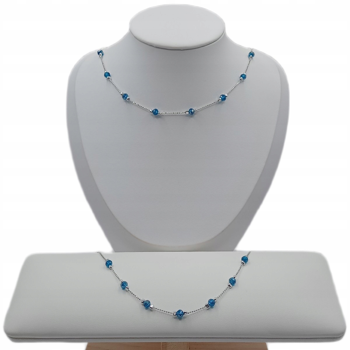 Poczuj powiew świeżości z kompletem Laguna od marki APHORA. To harmonijne połączenie srebrnego blasku i chłodnego błękitu, inspirowane spokojem morskiej zatoki. W skład zestawu wchodzi delikatny łańcuszek oraz bransoletka, wykonane ze srebra próby 925 i ozdobione szklanymi kulkami w odcieniu laguny.
